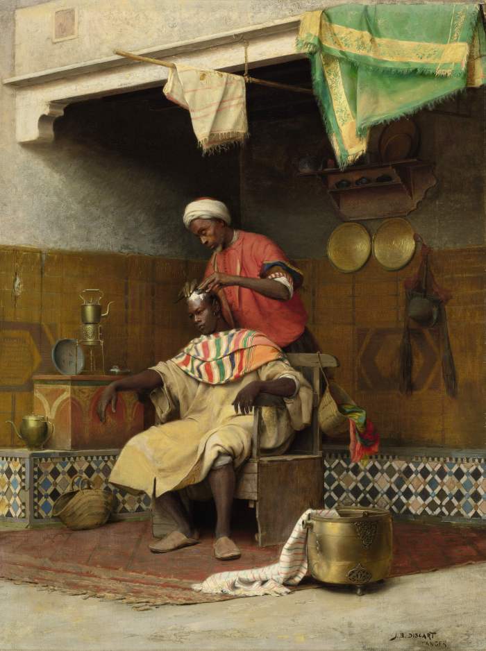 De kapperswinkel, olieverf op doek, 115,7 x 84,4 cm. J.B. Discart, Tanger. Verkocht bij Sotheby’s New York op de 19th Century European Art Veiling op 6 november 2014 onder nr. 35, opbrengst US $ 60.000.