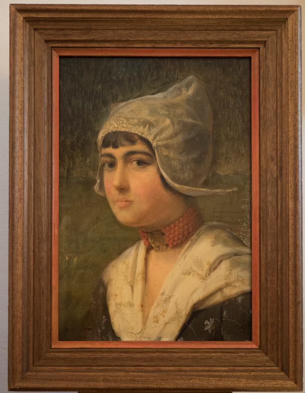 Volendams meisje, olieverf op board, 48 x 32,9 cm. Linksonder gesigneerd Discart, z.j. Jong meisje in klederdracht (Volendam) met muts en bloedkoralen ketting met gouden slot. Onder de muts heeft het meisje donker haar. Over de bruine japon draagt zij een witte doek. Op de achtergrond een boerenhek. Particuliere collectie.